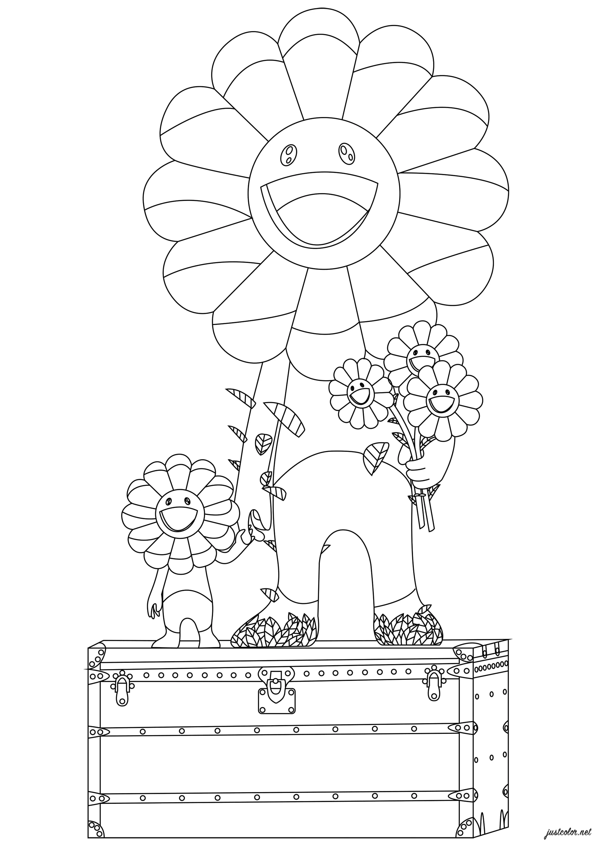 Takashi Murakami - A flor, o pai e a criança (Página de Arte pop para colorir)