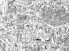 Very complex coloring page of an imaginary city with robots and other strange creatures - 4