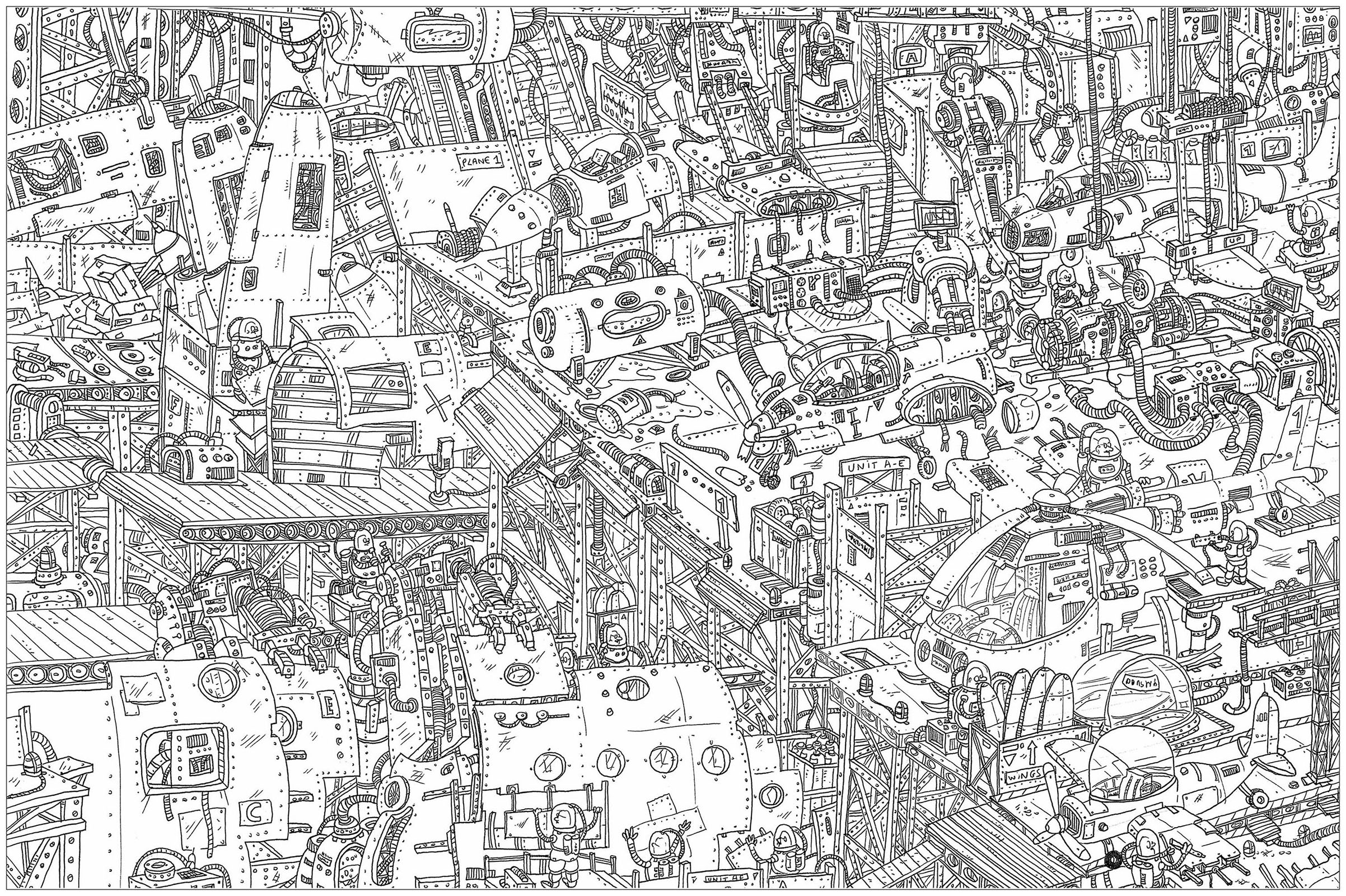 'Factory', a complex coloring page, 'Where is Waldo ?' style