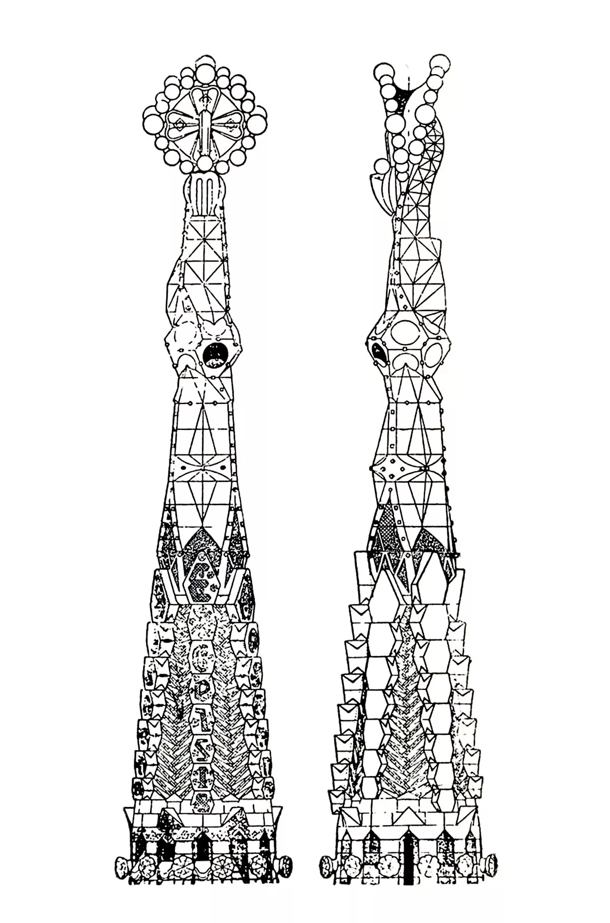 Drawing of two towers of the Sagrada Familia : the unfinished Cathedral by Gaudi.