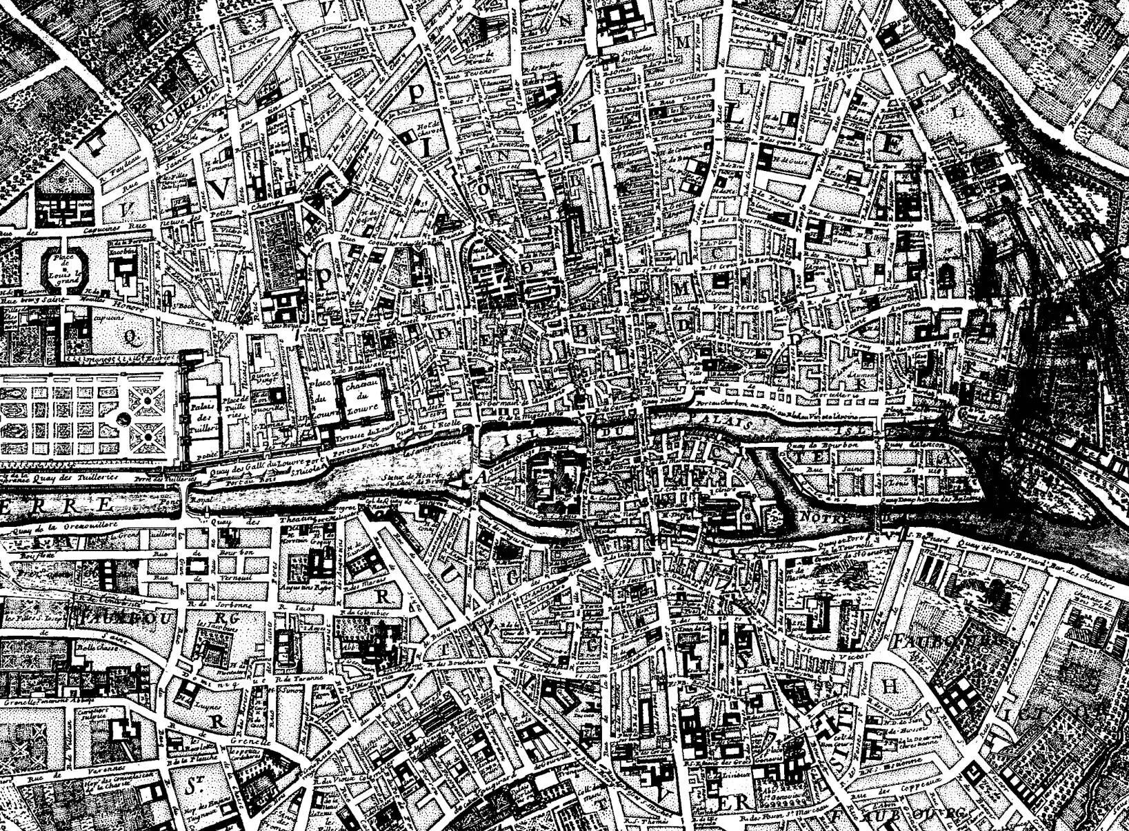 Drawings, sketches and engravings of monuments, as well as black and white photographs with high contrast. We even posted some old maps of the city of Paris, which show the evolution of the town planning over several centuries.