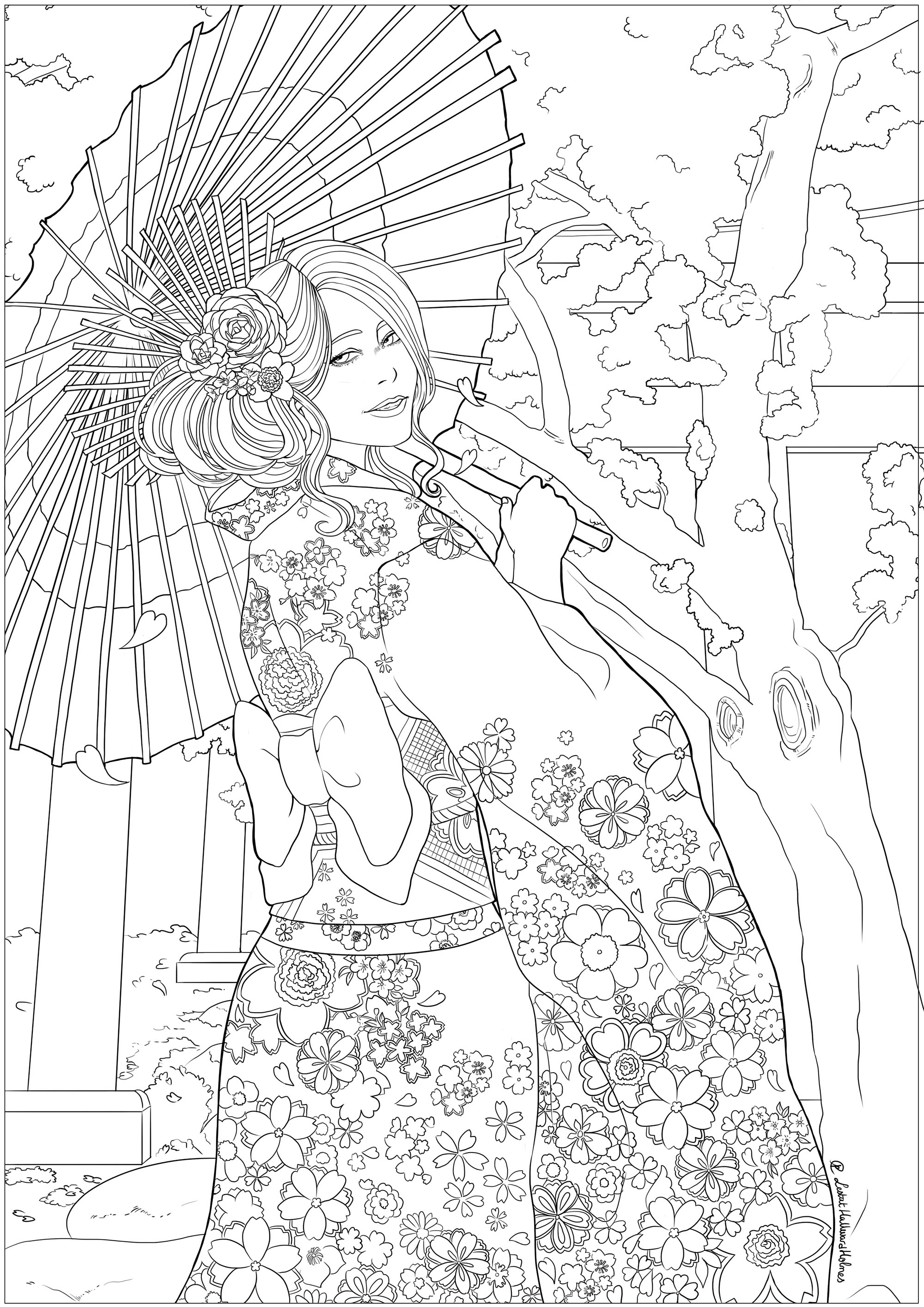 Japanese women celebrating Hanami (Japan Coloring Page)